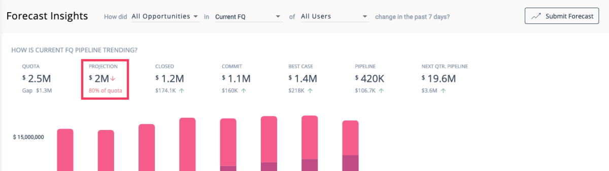 Sales leaders can use revenue projection to gain a clear perspective on what their projected revenue should look like, which can then be compared with the commit and best-case scenarios submitted by their teams and reps. This offers a vital insight when submitting forecasts as it enables them to hone in on which submissions have harmed forecasting accuracy in order to implement improvements for future quarters.