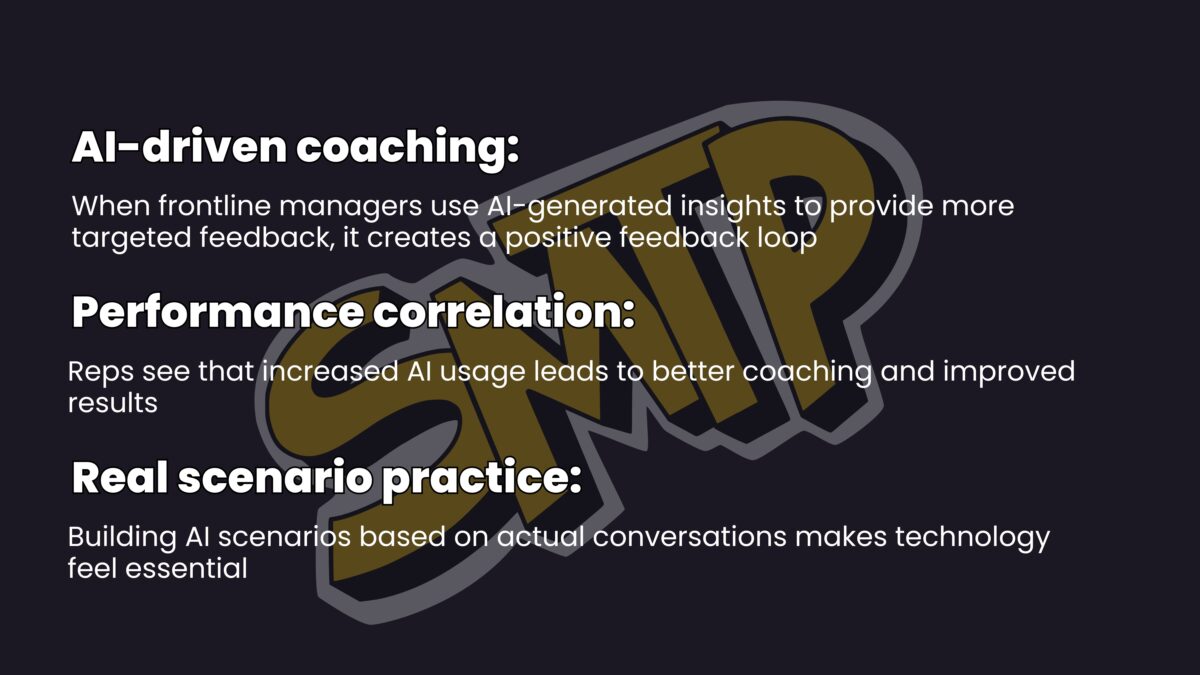 The most successful organizations stop tracking who’s using AI and start celebrating improved performance metrics. When team members connect AI usage to personal success: better meeting conversion rates, faster deal velocity, higher quota attainment – the behavior becomes self-reinforcing.